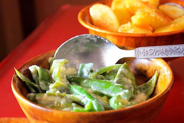 Cooked with radishes and spicy chili peppers, Phaksha Paa is a tasty pork dish. Red rice, a main element of Bhutanese cooking, is eaten with the cooked meat after it has become tender. The savory tastes of the pork are balanced by the heat of the chili in this rich and spicy dish.