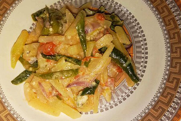 Kewa Datshi is a hearty dish prepared with cheese and potatoes that is suitable for vegetarians. Ema Datshi is comparable to this but without the chilies. The richness of the potatoes and the creamy cheese combine to create a tasty dinner.