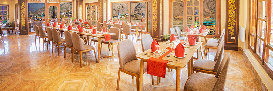 The Cliff Café at Hotel Paro Grand provides a comfy atmosphere with picturesque views for guests seeking a pleasant dining experience. It offers a range of international and Bhutanese cuisine, emphasizing the use of regional ingredients. After touring the town, the café is a great place to have a light lunch or some snacks.