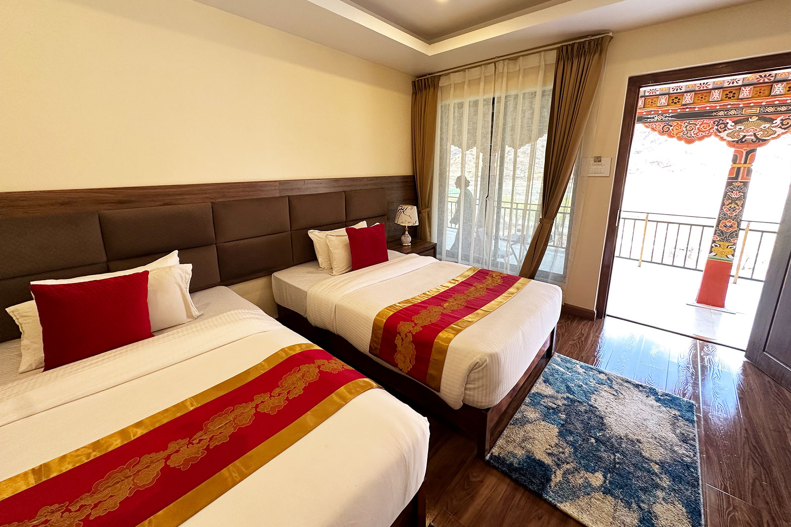 Relax on the lounge chairs while soaking in the breathtaking view of the PAA CHHU River, letting the serene surroundings enhance your experience. For any specific room preferences, simply mention them during booking. With top-notch amenities and a stunning riverside setting, our Riverfront Deluxe Rooms promise a stay of pure indulgence.